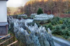 Der Einsatz von Paletten wird von uns bisher vermieden. Die genetzten Bäume werden stehend bis zum Abholtermin gelagert oder verbleiben sogar im Wald. Dadurch hat jeder Baum die Chance auf einen Schauer Regen oder auf den nächtlichen Tau. Diese Feuchtigkeit unterstützt den Baum später bei seiner Haltbarkeit im Wohnzimmer. Fachmännische Verladehilfe ist für uns selbstverständlich.